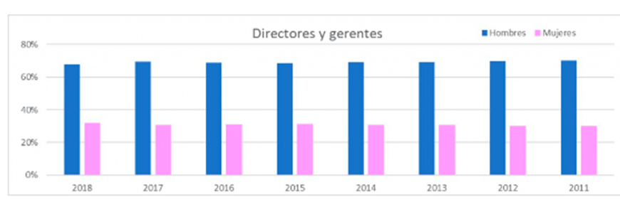 Diferente es el caso de los puestos directos, ya que para el año 2018 el 68% fueron ocupados por varones frente a solo un 32% de mujeres. Lastimosamente, esta tendencia, no ha crecido y se ha estancado desde el año 2011. Esto se debe, ya que aún en el campo laboral se vive mucha discriminación y estereotipos de que las mujeres no pueden liderar a un grupo. Llegando a la conclusión, que por 8 años consecutivos los puestos de dirección y gerencia siguen siendo liderado por los hombres.