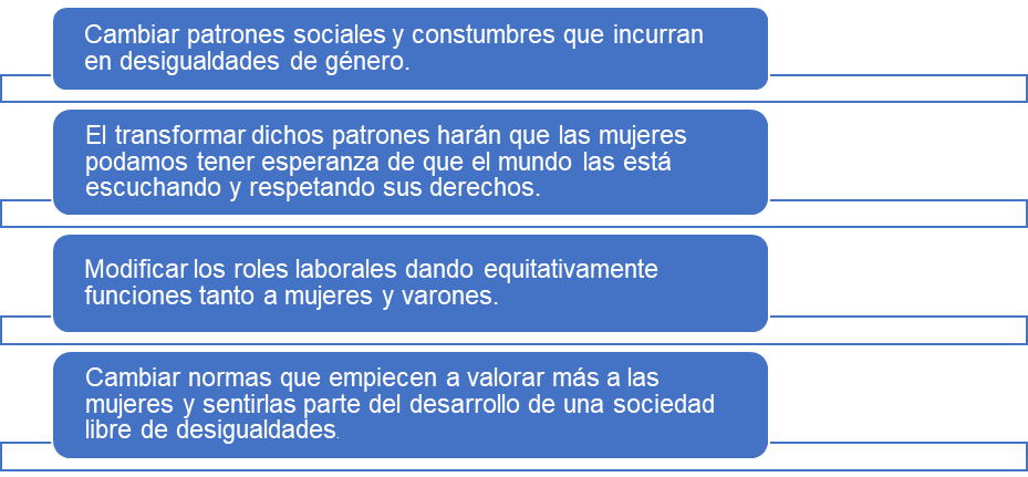 C) Patrones socioculturales discriminatorios que favorecen lo masculino sobre lo femenino: El 55% de mujeres ocupan cargos de enfermeras y profesoras de nivel inicial y primaria. Por otro lado, una cifra muy alarmante relacionada con el maltrato hacia la mujer, un 20, 4% consideran que deben seguir estando con su pareja o esposo. Finalmente, la forma como presenta al género femenino en los programas de televisión hace que carezca de equidad e igualdad de género.